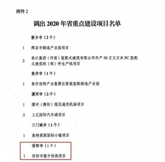 7月3日,河南重點項目建設辦公室發布《關于調出2020年省重點建設項目的通知》,信陽供暖項目確認被取消。
