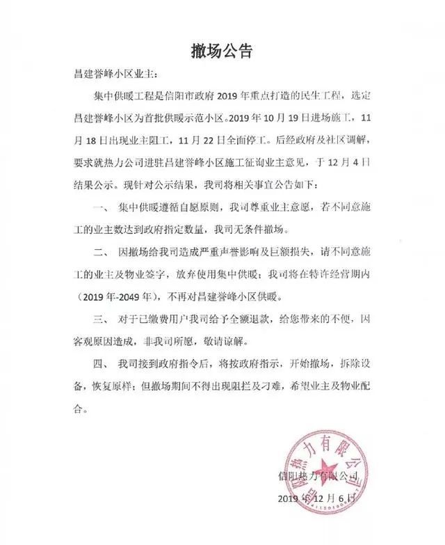 去年年底,信陽市平橋區龍江路沿線小區首批要實現集中供熱。供熱主管網本已經全線貫通,但由于業主們的強烈反對,信陽熱力公司停工。昌建譽峰小區總共1669戶,只有7戶簽字同意通暖,簽字不同意的有929戶,最終該項目爛尾。