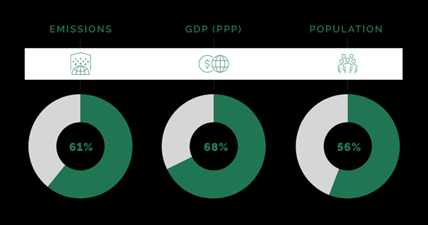 答:目前已有超過130個國家和地區提出了“零碳”或“碳中和”的氣候目標。已實現碳中和的2個國家,已立法的6個國家,處于立法中狀態的包括歐盟(作為整體)和其他5個國家。另外,有20個國家(包括歐盟國家)發布了正式的政策宣示。提出目標但尚處于討論過程中的國家和地區近100個。全球提出零碳目標的司法管轄區碳排放占比達到了61%,按購買力評價計算的GDP占比達到68%,人口占比達到了56%。