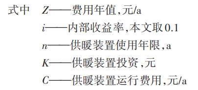 費用年值可以綜合投資和運行費用評估不同供暖方式的經濟性[10],因此本文采用費用年值對各類清潔供暖方式進行經濟性評價。費用年值Z的計算式為: