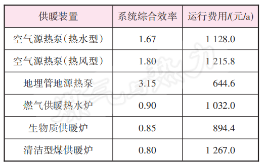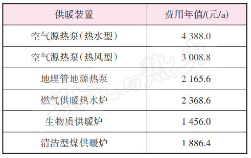 生物質燃料低位發熱量取20 GJ/t,清潔型煤低位發熱量取25 GJ/t。基于戶均供暖耗熱量,可計算得不同供暖裝置的運行能耗,從而計算運行費用,見表4。表4中,除熱風型空氣源熱泵外,其他供暖裝置的系統綜合效率均考慮了室內供暖系統輸送效率。電價為0.576 9 元/(kW·h),天然氣氣價為2.58 元/m3,生物質燃料價格為1 200 元/t,清潔型煤價格為2 000 元/t。