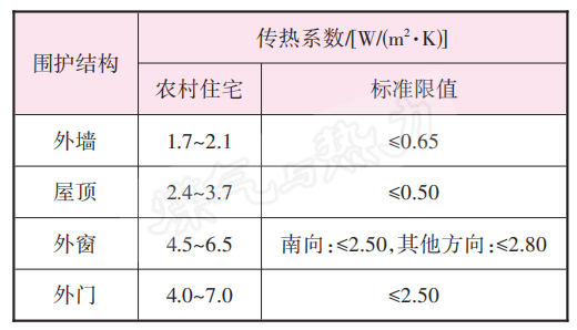 ② 農村住宅的保溫性能差,圍護結構傳熱系數遠高于GB/T 50824—2013《農村居住建筑節能設計標準》限值。