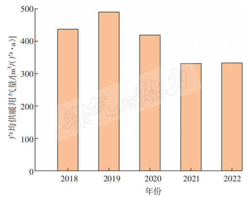 燃氣供暖熱水爐用戶2018—2022年戶均供暖用氣量見圖5。由圖5可知,戶均供暖用氣量先增后降,最終趨于平穩。主要原因:在清潔供暖改造初期,居民的熱情高漲、政府補貼到位率較高,戶均供暖用氣量快速增長,2019年達到了最高值。但相比煤炭,天然氣價格較高,隨著政府3年補貼期滿,大部分農村居民通過降低室溫、縮短供暖時間等方式來減小天然氣用量,降低供暖費用。