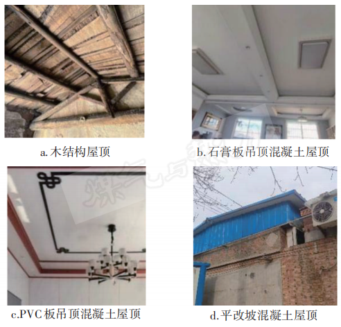 農村住宅屋頂見圖3,可分為木結構(見圖3a)、混凝土屋頂。大部分混凝土屋頂進行了簡單吊頂:石膏板吊頂(見圖3b)、PVC板吊頂(圖3c),僅有極少數混凝土屋頂進行了平改坡(見圖3d)。平改坡屋頂在屋頂上形成1個空間,冬季可起到保溫作用,夏季可以打開通風口進行通風。整體上農村住宅屋頂保溫性能較差。