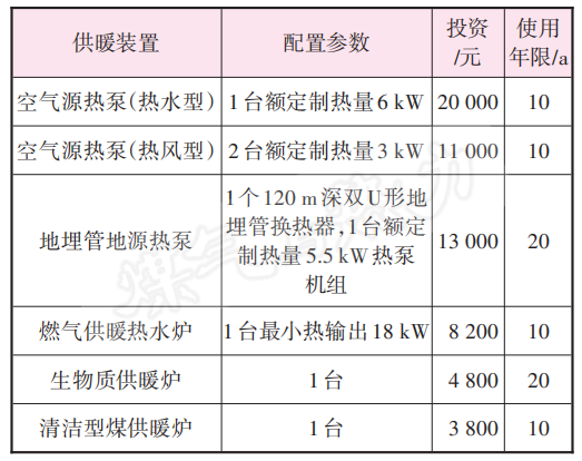 不同供暖裝置的投資及使用年限見表3。由于目前市場上的燃氣供暖熱水爐熱輸出均比較高,因此只能選取最小熱輸出為18 kW的燃氣供暖熱水爐。供暖裝置投資含供暖裝置購置費及安裝費,除熱風型空氣源熱泵外,其他供暖裝置的安裝費不僅含供暖裝置本體的安裝費,還含室內供暖系統(均按2間房間供暖考慮)安裝費。此外,地埋管地源熱泵的安裝費還包括地埋管換熱器及鉆孔費用。