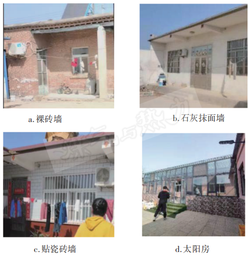 農村住宅外墻見圖2。90%以上為240 mm厚磚混結構,包括裸磚墻(見圖2a)、石灰抹面墻(見圖2b)、貼瓷磚墻(見圖2c),缺乏保溫措施。約10%農村住宅建設南向太陽房(圖2d),太陽房均建設在原有正房南墻外側,太陽房的構造通常包括特制的窗及玻璃幕墻,利用太陽輻射提高室內溫度,提供冬季溫暖的居住空間。