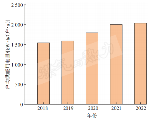 空氣源熱泵用戶2018—2022年戶均供暖用電量見圖6。由圖6可知,戶均供暖用電量逐年增加。從統計結果來看,空氣源熱泵供暖費用較低,農村居民經濟負擔小。隨著農村居民收入不斷增加,供暖用電量將逐年增長。