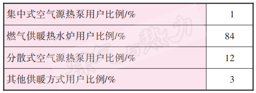 聊城農村人口總數約360.2×104 人,約145.7×104 戶。根據來自聊城市城市管理局的數據,截至2022年底,聊城農村清潔供暖改造達到121.6×104 戶,位居全省第一。結合農村住宅的分布特點及集中式清潔供暖方式的適用條件,僅少量的新型農村社區采用了集中式空氣源熱泵供暖方式,占比約1%,其他農村供暖用戶采用了分散式供暖方式。各類清潔供暖方式用戶比例見表1。由表1可知,在分散式供暖用戶中,燃氣供暖熱水爐用戶比例最高,分散式空氣源熱泵用戶(簡稱空氣源熱泵用戶)次之,剩余用戶采用了家用電暖器、碳晶板、生物質供暖爐等供暖方式。家用電暖器、碳晶板均屬于電供暖設備,適合在家庭使用。家用電暖器包括電熱風扇、輻射式電暖器等。