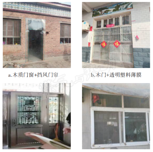 農村住宅外門窗主要有單層鋁合金門窗、單層木質門窗、單層塑鋼窗等,見圖4。冬季冷風滲透嚴重,特別是木質門窗。為減少冷風侵入,部分農戶采取木質門窗+擋風門簾,以及木門+透明塑料薄膜等簡易防風措施。