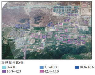 利用ArcGIS軟件中經典的太陽輻射工具,計算得到供暖期太陽能總輻射量為750 MJ/m2。將ArcGIS軟件提取的建筑屋頂正投影面積、不同建筑屋頂形態類型對應的屋頂利用系數等已知條件代入相關計算式,可計算得到每棟建筑集熱器日集熱量、集熱量占比。每棟建筑集熱器日集熱量、集熱量占比分布分別見圖2、3。