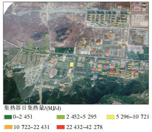太陽能輔助供暖潛力評估包括以下步驟:a.確定屋頂利用系數:借助ArcGIS軟件獲取建筑屋頂正投影面積、建筑屋頂形態,從而確定屋頂利用系數(可用屋頂面積與ArcGIS軟件提取的建筑屋頂正投影面積的比值)。b.確定集熱器參數(集熱器類型、安裝傾角、集熱效率等),計算太陽能集熱器安裝面積、日均集熱量。c.計算集熱器日集熱量占日供熱量比例,比例越高說明建筑太陽能輔助供暖潛力越大。