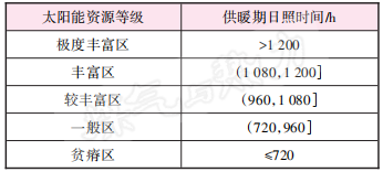 將彩石鎮太陽能資源按照供暖期日照時間分為5個等級:極度豐富區、豐富區、較豐富區、一般區、貧瘠區,見表1。彩石鎮北部、東北部、北宅科村、朝陽村等較為平坦的地區,由于沒有地形遮擋,供暖期日照時間大于1 200 h,屬于太陽能資源極度豐富區,適合推行太陽能輔助供暖系統。彩石鎮南部山谷底部的平坦地區,太陽輻射受地形遮擋的影響較少,屬于太陽能資源豐富區,且該地區面積也比較大,可作為彩石鎮未來太陽能規模化利用的重點開發區域。