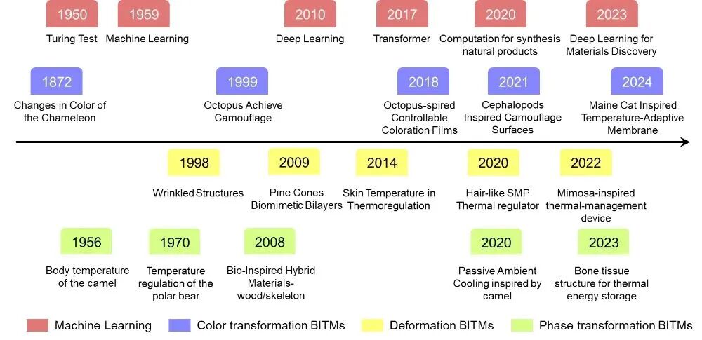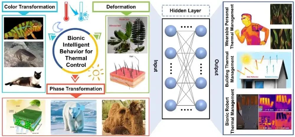 近日,天津大學(xué)材料科學(xué)與工程學(xué)院封偉教授團隊在國際權(quán)威材料期刊《Advanced Materials》(lF= 27.4)上發(fā)表題為" Biomimetic Intelligent Thermal Management Materials: From Nature-Inspired Design to Machine Learning-Driven Discovery"的重要綜述文章,系統(tǒng)地綜合了自然啟發(fā)和數(shù)據(jù)驅(qū)動的仿生智能熱管理材料的最新進展。詳細(xì)介紹了生物的熱調(diào)節(jié)原理啟發(fā)開發(fā)仿生智能熱管理材料的進展,包括基于顏色轉(zhuǎn)換、結(jié)構(gòu)變形和相變的策略。并深入探討了機器學(xué)習(xí)在仿生智能熱管理材料中的應(yīng)用,探索了如何利用大規(guī)模數(shù)據(jù)分析來增強材料的結(jié)構(gòu)和性能。最后展望了仿生智能熱管理材料當(dāng)前存在的挑戰(zhàn)和未來的發(fā)展方向。論文的第一作者為天津大學(xué)材料科學(xué)與工程學(xué)院博士生張恒、博士生何青霞和德累斯頓萊布尼茨聚合物研究所博士后張飛,通訊作者為天津大學(xué)封偉教授。相關(guān)研究獲得國家重點基金項目、科技部重點研發(fā)項目等支持。一、仿生設(shè)計原理 自然界的生物經(jīng)過長期進化,形成了高效的熱管理機制。例如,變色龍的皮膚通過調(diào)節(jié)顏色反射或吸收熱量,而北極熊的毛發(fā)則提供了卓越的隔熱性能。這些自然結(jié)構(gòu)為材料設(shè)計提供了豐富的靈感源泉。研究者們通過模仿這些生物結(jié)構(gòu),開發(fā)出能夠智能調(diào)節(jié)熱流的材料,為熱管理領(lǐng)域帶來了創(chuàng)新解決方案。仿生智能熱管理材料的設(shè)計基于對生物熱管理機制的深入模仿。例如,研究者們開發(fā)出能夠響應(yīng)環(huán)境變化(如溫度、濕度和壓力)的材料,這些材料可以動態(tài)調(diào)整其熱性能,實現(xiàn)精確的熱能控制和管理。這種智能響應(yīng)特性使得仿生智能熱管理材料在多變環(huán)境中具有廣泛的應(yīng)用潛力。