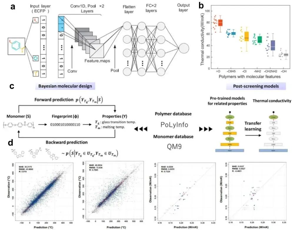 圖4 相變仿生智能熱管理材料 三、機器學(xué)習(xí)的賦能:數(shù)據(jù)驅(qū)動的材料設(shè)計與優(yōu)化 3.1.機器學(xué)習(xí)在熱管理材料領(lǐng)域中的優(yōu)勢 人工智能和5G的進步推動了新的散熱要求的出現(xiàn),強調(diào)了高性能仿生智能熱管理材料的必要性。在電子設(shè)備性能優(yōu)化與壽命提升領(lǐng)域,新型熱管理材料的開發(fā)已成為關(guān)鍵課題。機器學(xué)習(xí)技術(shù)的快速出現(xiàn)進一步加劇了開發(fā)新型熱管理材料的迫切需要,這為推進新型熱管理材料的發(fā)展提供了前所未有的機會和平臺。在早期的研究中,科學(xué)家主要依靠實驗方法和理論計算來研究熱管理材料的導(dǎo)熱性,這不僅耗時耗力,而且在處理復(fù)雜的數(shù)據(jù)集和多因素關(guān)系時也會遇到限制。機器學(xué)習(xí)的出現(xiàn)徹底改變了這一范式。通過分析現(xiàn)有材料性能和結(jié)構(gòu)數(shù)據(jù)的廣泛數(shù)據(jù)集,訓(xùn)練機器學(xué)習(xí)算法來模擬材料性能和關(guān)鍵特征之間的復(fù)雜關(guān)系。這種方法的優(yōu)點在于它能夠從歷史數(shù)據(jù)中識別模式,從而促進對材料性能的有效預(yù)測。隨著人工智能的不斷進步,機器學(xué)習(xí)越來越多地應(yīng)用于聚合物材料研究,其目的是預(yù)測材料性能和發(fā)現(xiàn)新型聚合物材料。機器學(xué)習(xí)已經(jīng)超越了傳統(tǒng)“試錯”方法的局限性,通過構(gòu)建復(fù)雜的模型,將材料結(jié)構(gòu)和特性與基于數(shù)據(jù)驅(qū)動的見解所需的性能相關(guān)聯(lián),從而解決了與聚合物的組成和復(fù)雜結(jié)構(gòu)相關(guān)的挑戰(zhàn)。