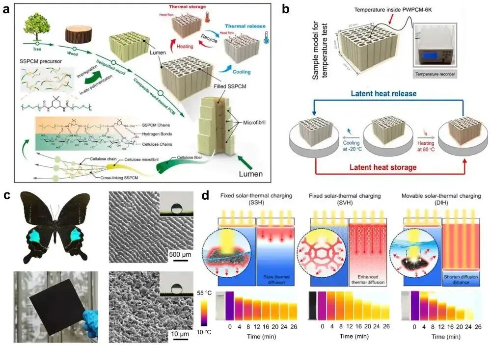 圖3 形變仿生智能熱管理材料 2.3 相變仿生智能熱管理材料 相變型仿生智能熱管理材料通過模仿生物相變調(diào)控機制,結(jié)合相變材料(PCMs)的高儲能特性與仿生結(jié)構(gòu)設(shè)計,實現(xiàn)高效熱能存儲與動態(tài)溫度管理。在相變儲能領(lǐng)域,傳統(tǒng)材料面臨泄漏、體積形變及機械強度不足等挑戰(zhàn),而仿生多孔支架結(jié)構(gòu)(如蝴蝶翅脈啟發(fā)的多級孔隙網(wǎng)絡(luò))通過毛細(xì)作用約束液態(tài)相變材料,顯著提升形狀穩(wěn)定性與熱導(dǎo)率,同時生物質(zhì)衍生材料(如類骨“磚-泥”結(jié)構(gòu))的引入進一步增強了復(fù)合材料的機械強度與熱循環(huán)耐久性。蒸發(fā)熱管理方向則通過仿生蒸騰與排汗機制,構(gòu)建基于水蒸發(fā)相變的高效散熱系統(tǒng):植物氣孔啟發(fā)的吸濕光熱凝膠可動態(tài)調(diào)控大氣水分捕獲與蒸發(fā)冷卻,實現(xiàn)跨濕度環(huán)境的熱管理。兩類策略均利用相變潛熱實現(xiàn)無源熱調(diào)控,其核心創(chuàng)新在于仿生結(jié)構(gòu)對相變過程的多尺度調(diào)控。