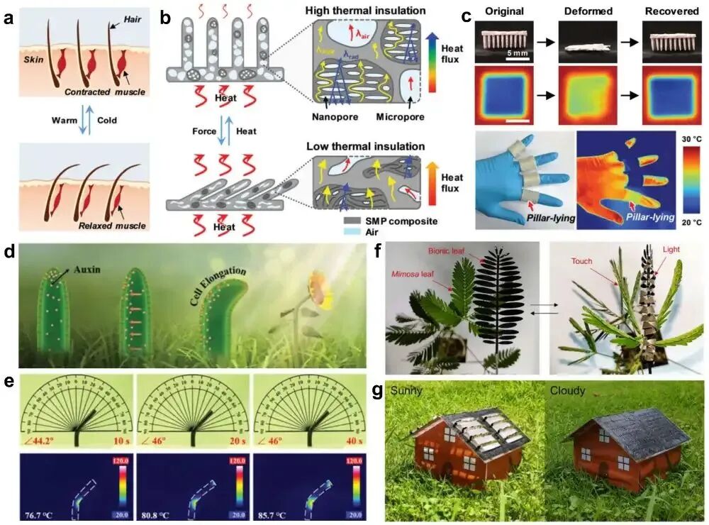 圖2 顏色變換仿生智能熱管理材料 2.2 形變仿生智能熱管理材料 基于變形機制的仿生智能熱管理材料通過動態(tài)調(diào)控?zé)醾鲗?dǎo)路徑實現(xiàn)高效熱管理,其核心在于響應(yīng)溫度、光照或濕度等環(huán)境刺激,自主改變材料內(nèi)部結(jié)構(gòu)以調(diào)節(jié)熱導(dǎo)率與熱流分布。該材料可分為熱驅(qū)動、光驅(qū)動及濕度驅(qū)動三類:熱驅(qū)動型通過形狀記憶效應(yīng)模擬生物毛發(fā)直立機制,在溫度變化下可逆切換微孔結(jié)構(gòu)狀態(tài),實現(xiàn)熱絕緣性能的動態(tài)調(diào)控;光驅(qū)動型借鑒植物向光性原理,利用光熱轉(zhuǎn)換與熱致變形耦合效應(yīng),構(gòu)建具有徑向溫度梯度的仿生執(zhí)行器,實現(xiàn)全角度光追蹤及精準(zhǔn)熱流定向控制;濕度驅(qū)動型則模擬植物吸濕膨脹行為,通過親疏水基團的可逆相變調(diào)節(jié)材料膨脹系數(shù),結(jié)合非對稱熱膨脹效應(yīng)實現(xiàn)濕度響應(yīng)的雙向調(diào)溫功能。三類材料均通過仿生結(jié)構(gòu)變形實現(xiàn)無源能量輸入的自適應(yīng)熱管理。