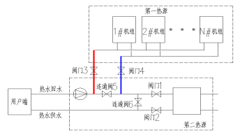 該系統(tǒng)特點(diǎn)是能夠最大限度利用第一熱源,使其發(fā)揮最大供熱能力,第二熱源作為補(bǔ)充及保障。一般情況下,第一熱源適用于集中供熱系統(tǒng),如不具備集中供熱條件,可選取空氣源熱泵系統(tǒng);第二熱源應(yīng)為供熱能力穩(wěn)定,但能源成本較高的系統(tǒng),多種熱源串聯(lián)共網(wǎng)運(yùn)行,實(shí)現(xiàn)低成本熱源能量的極限利用,并保障供熱系統(tǒng)安全、充足、穩(wěn)定運(yùn)行。