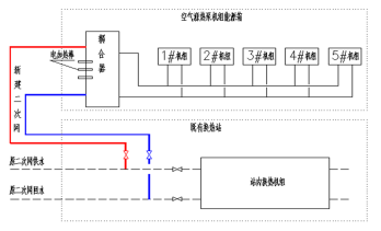 當(dāng)出現(xiàn)極寒天氣,或是其他因素導(dǎo)致集中供熱系統(tǒng)出現(xiàn)波動(dòng)不能有效滿足區(qū)域采暖需求時(shí),可以采用集中供熱系統(tǒng)為主、空氣源熱泵補(bǔ)充熱量的形式,從而滿足采暖負(fù)荷需求。