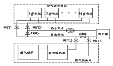 因此,結(jié)合該區(qū)域?qū)嶋H狀況,探索新的熱源模式以降低供熱生產(chǎn)成本。建立電空氣源熱泵為主、燃?xì)忮仩t為輔的共網(wǎng)運(yùn)行系統(tǒng),如下圖5所示。