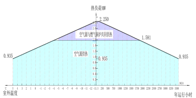 依據(jù)該區(qū)域負(fù)荷及冬季室外氣溫狀況,繪制熱負(fù)荷延續(xù)曲線如下圖6所示。當(dāng)冬季室外氣溫高于-4℃、負(fù)荷低于1.6MW時(shí),以電空氣源熱泵為單一熱源獨(dú)立供熱;當(dāng)室外氣溫降至-4℃及以下時(shí),熱泵已提供最大負(fù)荷但仍不能滿足采暖需求,此時(shí)啟動(dòng)燃?xì)忮仩t補(bǔ)充熱量。