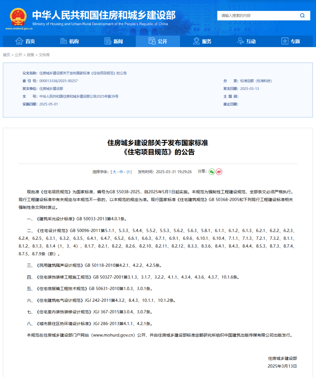 3月31日,住房城鄉(xiāng)建設(shè)部發(fā)布國(guó)家標(biāo)準(zhǔn)《住宅項(xiàng)目規(guī)范》。規(guī)范將于今年5月1日起施行,要求住宅項(xiàng)目建設(shè)應(yīng)以安全、舒適、綠色、智慧為目標(biāo),遵循“經(jīng)濟(jì)合理、安全耐久,以人為本、健康舒適,因地制宜、綠色低碳,科技賦能、智慧便利”的原則。該規(guī)范為強(qiáng)制性工程建設(shè)規(guī)范,全部條文必須嚴(yán)格執(zhí)行。